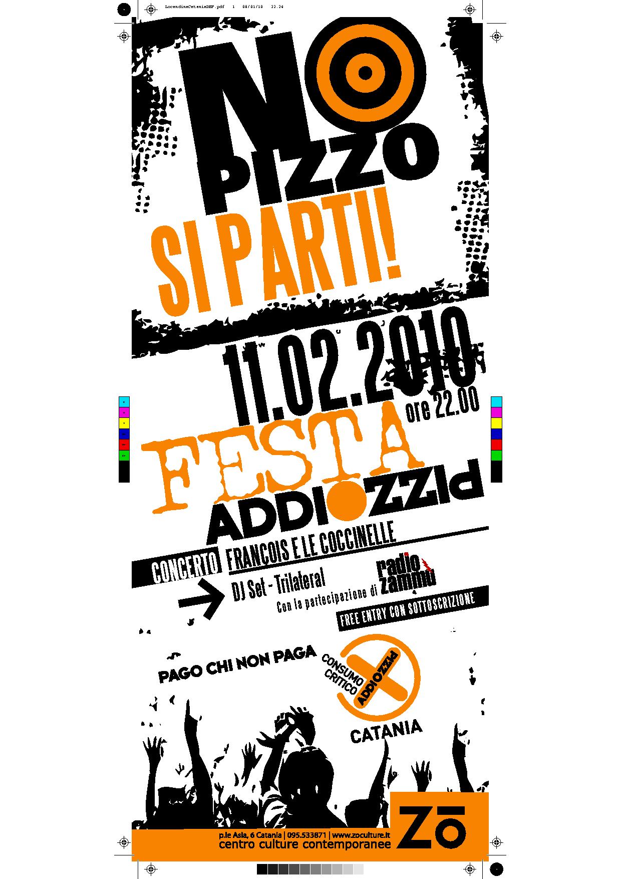 L'11 febbraio dalle ore 22 si terrà al Centro Zo di Catania, in piazzale Asia 6, la festa "No pizzo, si parti!", organizzata dall'associazione Addiopizzo Catania. L'associazione vuole ricordare, attraverso un momento di divertimento con concerto e dj set per sensibilizzare anche i più giovani sull'argomento e per festeggiare i suoi primi tre anni di attività, che la piaga del pizzo si deve combattere tutti insieme.